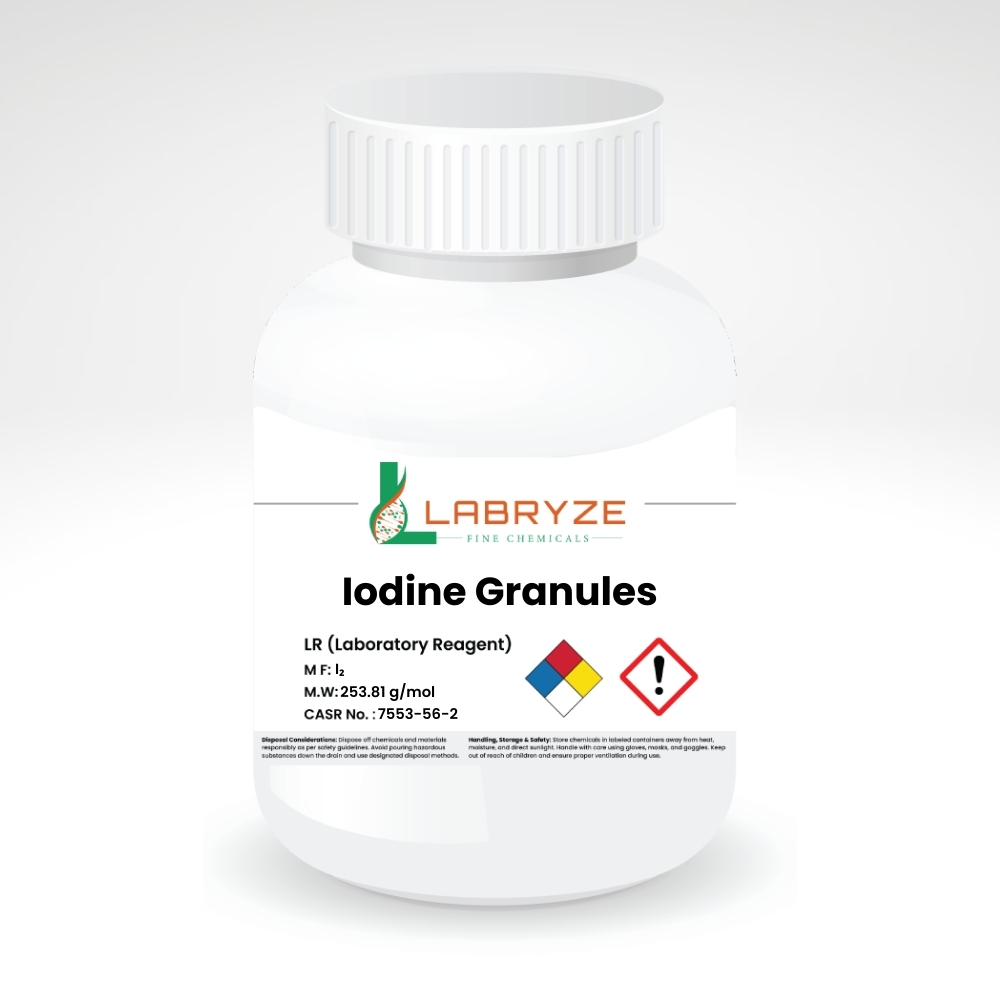 Iodine Granules, Lab Grade, are dark crystalline solids used widely in analytical, inorganic, and organic chemistry. In laboratories, iodine is employed in redox titrations, iodometric analysis, halogenation reactions, and qualitative testing for starch. The granular form allows controlled handling and gradual dissolution in solvents. Lab-grade iodine provides high purity, consistent sublimation behavior, and reliable reactivity, making it suitable for research experiments, educational demonstrations, and analytical procedures requiring accurate iodine chemistry.
